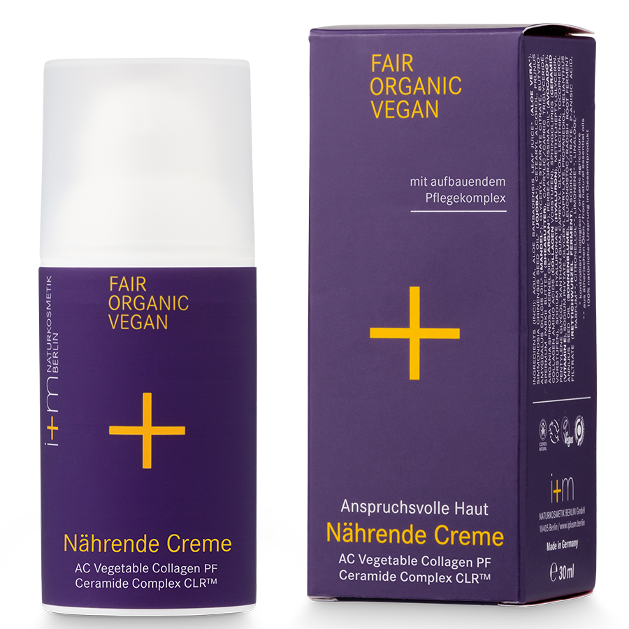 La crema nutritiva i+m para pieles exigentes crea una protección multifacética contra la contaminación ambiental. Su mezcla de lípidos de origen vegetal, con precursores de ceramidas y aceites orgánicos prensados en frío de comercio justo, fortalece y repara la barrera natural de la piel. Esta rica crema facial, con su cálida fragancia y notas frutales y florales, también mejora la suavidad de las arrugas causadas por el envejecimiento, aportando una hidratación extra.